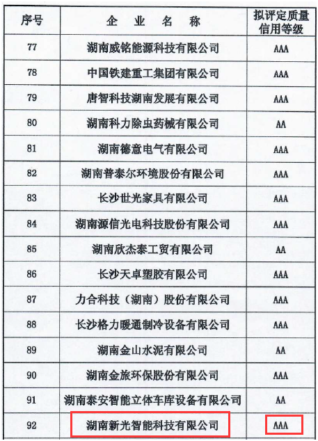 其中,湖南新光智能科技有限公司被評(píng)為3A的質(zhì)量信用等級(jí)企業(yè)之一