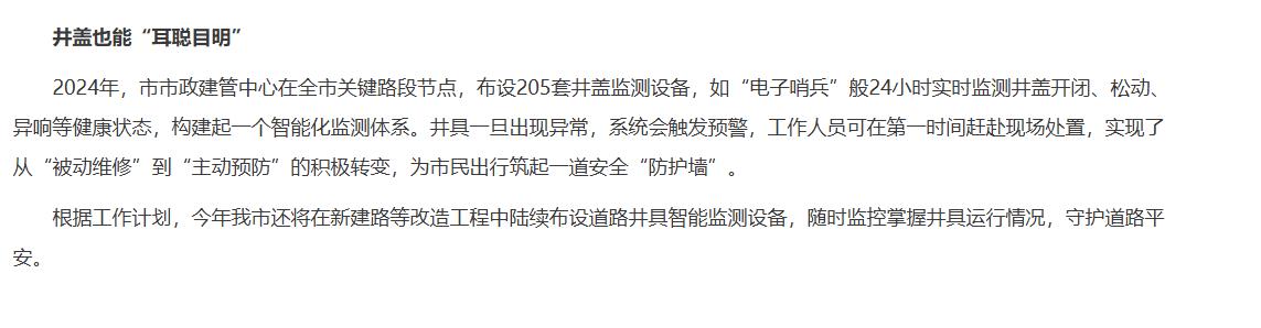 為解決這些問題,多地已經(jīng)試點安裝智能井蓋,比如2024年,太原市市政建管中心在全市關鍵路段節(jié)點,布設205套井蓋監(jiān)測設備,如“電子哨兵”般24小時實時監(jiān)測井蓋開閉、松動、異響等健康狀態(tài),構建起一個智能化監(jiān)測體系。