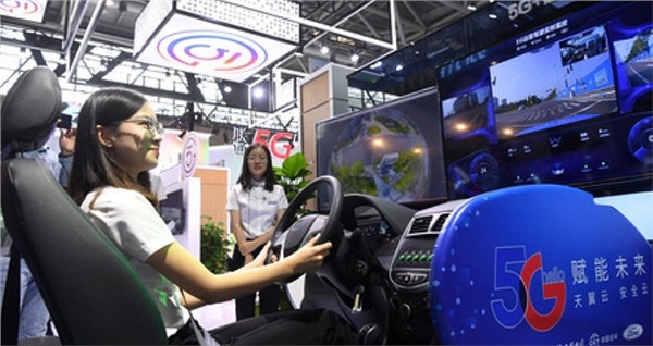 工作人員在智博會上演示“5G+遠程駕駛”技術