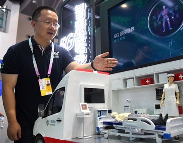 工作人員在智博會上介紹“5G智慧醫(yī)療”中的“5G遠程急救”技術
