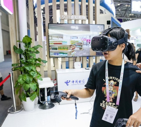 中國電信展廳內,一名小女孩體驗5G虛擬在線購物