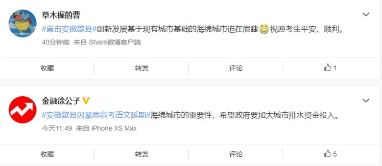 高考第一天,安徽歙縣遭遇50年一遇的洪澇災(zāi)害,歙縣考區(qū)原定7月7日語文、數(shù)學(xué)科目考試延期舉行。微博上,網(wǎng)友們在為高考考生和歙縣人民生命財產(chǎn)憂心的同時,也對歙縣的排水系統(tǒng)、城市建設(shè)與精細(xì)化管理等問題進(jìn)行了關(guān)注。